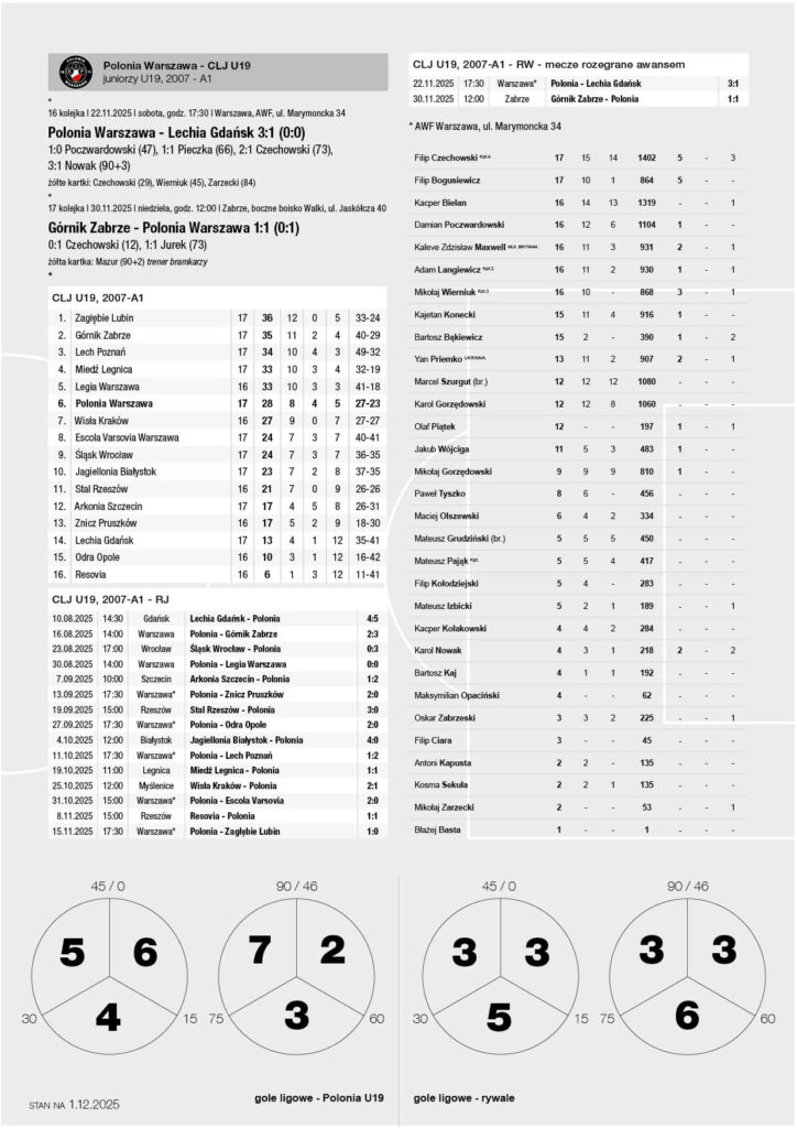Pisząc o losach naszej drużyny CLJ w poprzednim numerze wskazywałem na to, jak trudnym, ale zarazem ciekawym meczem może być starcie z Górnikiem Zabrze. Zespół ten spisuje się w obecnych rozgrywkach znakomicie, a dla mnie osobiście ze wszystkich drużyn widzianych w tym sezonie sprawiał wrażenie najdojrzalszej. Dość powiedzieć, że w starciu z naszą drużyną mieli okazję objąć pozycję lidera, gdyby zdobyli trzy punkty. Mogli więc przeżyć mały szok, gdy w 12. minucie Filip Czechowski wykorzystał rzut wolny i to Czarne Koszule objęły prowadzenie. W kolejnych minutach nasza drużyna skoncentrowała się na powstrzymywaniu huraganowego naporu rywala i długo przynosiło to rezultat, aż nadeszła 73. minuta, kiedy to z bliska w zamieszaniu w polu karnym wyrównującą bramkę strzelił Jeremiasz Jurek. Do końca spotkania wynik nie uległ zmianie.