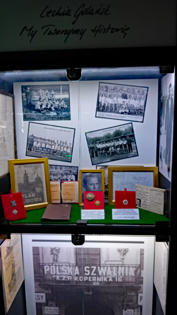 Znając moje zacięcie „kresowe”, nie zawiodłem się i w tej kwestii. W Gdańsku pamiętają o swoich korzeniach. Tutaj szczególne wrażenie zrobiła na mnie „lwowska” gablota z pamiątkami po „Lechii” Lwów, w tym zdjęcie bramy, gdzie mieściła się siedziba najstarszego polskiego klubu założonego w 1903 roku, jeszcze przed „Czarnymi” Lwów i „Pogonią” Lwów. I tutaj mała dygresja, ta brama istniej do dzisiaj przy ul. Kopernika 16 „we Lwowi”, jak to dawniej mówiono w mieście nad Pełtwią (ulica też nie zmieniła nazwy, co jest wyjątkiem w tym grodzie).